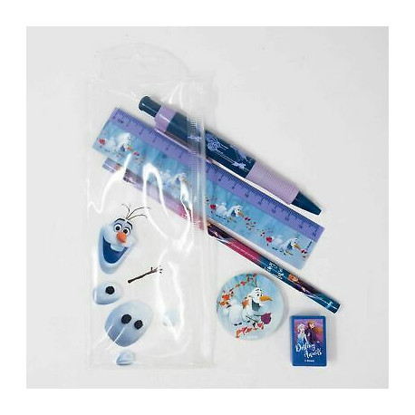 Sada školních pomůcek s motivem pohádky Frozen. Sada obsahuje: průhledný penál, pravítko, tužku, propisku, gumu a ořezávátko. Oficiální licence: Frozen